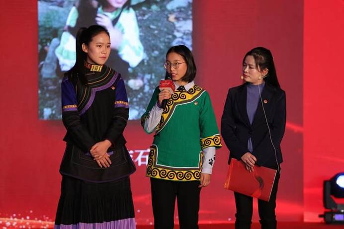 希望工程受助生代表沙马阿牛、巴足作石及凉山州越西县团委书记王国娟(右一)分享大凉山孩子们成长的故事