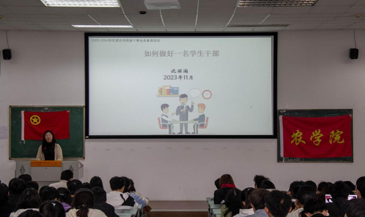 为促进农学院干事业务素质能力,农学院从11月30日开始,开展了为期一周的新干事培训课程。新干事培训课程由农学院党委书记黎明艳,党委办公室副主任、团委副书记沈丽淘,团委老师贾佳,现中国农业大学硕士研究生、四川农业大学农学院2018级团委学生兼职副书记田德文,学生融媒体中心主干杜丹莹,团委办公室主干韩雪、李承俊讲授。农学院共计200多位新生干事参加培训。