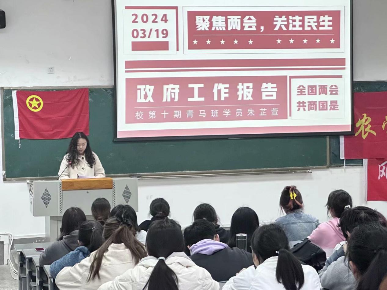 班团活动现场,支部主要围绕两会精神进行了学习。植保202202团支部万红伶通过读文章的方式,领学习近平总书记全国两会系列重要讲话精神,与习近平总书记“面对面交流”。同时,支部邀请到校级青马班的优秀代表朱芷萱和学员李铭宏领学全国两会主要内容。其中,朱芷萱从就业、教育等五个民生方面解读政策。李铭宏则从学习建设科技强国思想的角度出发,以川农人的身份,号召大家担当历史责任,争做新时代农业强国的建设者。在三位同学对全国两会精神及主要内容的领学下,各支部青年学子更加清晰地认识到了国家发展的方向和目标,也深刻感受到了作为新时代青年的责任和担当。