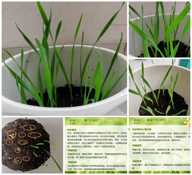 本次活动旨在深入贯彻习近平总书记“9·5 回信”精神,培养同学们的三农情怀,激发创新潜能。活动分为线上知识答题、线下种植体验和科普知识打卡三个部分。线上答题环节,同学们积极学习,在一道道题目中加深对“9·5 回信”精神、农业政策及农学知识的了解;线下种植体验活动中,同学们亲自动手,自行探索小麦的种植方法,记录小麦从发芽到成熟收获的种植过程;科普知识打卡则通过易班平台分享大家了解到的农业科技创新成果,在分享中增长知识、培养三农情怀。