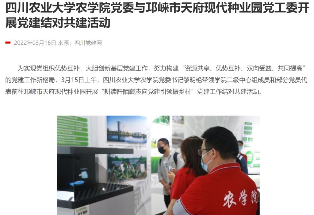 据悉,四川农业大学农学院党委和天府现代种业园党工委均荣获 2021年“四川省先进基层党组织”荣誉称号。此次党建结对共建活动圆满举行,既是四川农业大学农学院创新党建工作的有益尝试,也是向其他优秀基层党组织学习交流的重要契机。借助党建共建平台,双方表示将不断强化信息沟通和业务合作,继续发挥好四川农业大学农学院在作物领域方面的科教优势和天府现代种业园在种业创新方面的资源优势与集聚效应,以强农兴农为己任,充分发挥共产党员先锋作用为重点,合力打造坚强的组织战斗壁垒,以共建深化创新,以党建促进发展,共同探索校、地党建共建新途径,积极推进农业科技创新,服务全面推进乡村振兴、加快农业农村现代化发展。(贾佳)