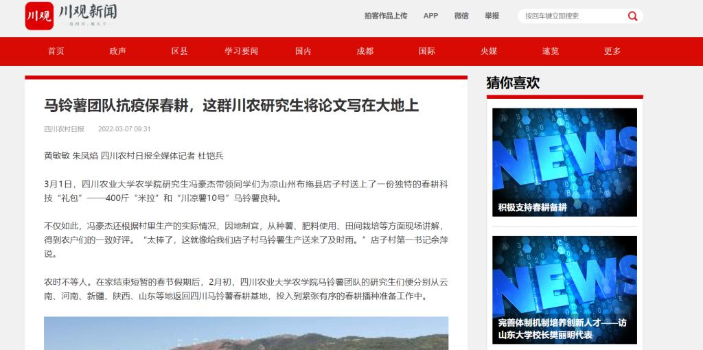 据四川农业大学农学院相关负责人介绍,这些论文的试验结果,也将进一步深入持续服务指导当地马铃薯绿色轻简化优质高产,推进马铃薯产业发展,巩固脱贫攻坚成果与乡村振兴有效衔接:“马铃薯团队抗疫情保春耕,助力乡村振兴在路上。”