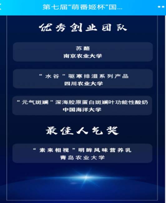 2020年12月12日,由农业农村部乡村产业发展司指导的第七届“萌番姬杯”国际大学生农业创新创业大赛总决赛在上海交通大学开赛,四川农业大学农学院“水谷”团队与中国农业大学、中国海洋大学、南京农业大学等9所高校团队同台竞技,荣获“优秀创业团队”殊荣。
