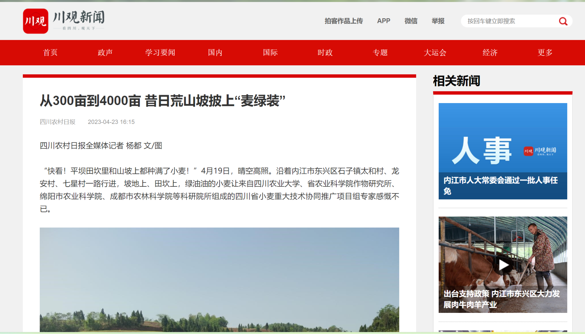 受益于“五良融合”宜机化改造项目,内江市东兴区、资中县等地昔日的“荒山坡”和撂荒地正焕发生机。“通过将杂草丛生的荒山荒坡改造成为适宜机械化耕种的梯土梯田,并通过机播机收等农业机械化手段种植优质小麦,优质粮油播种面积正逐渐扩大。”黄辉跃介绍,在此基础上,他们还在市中区、威远县、隆昌市等地做了相应的技术示范。如今,小麦种植面积的恢复性增长,荒山坡再披“绿装”,是丘陵区助力新时代更高水平“天府粮仓”建设的深入实践。
