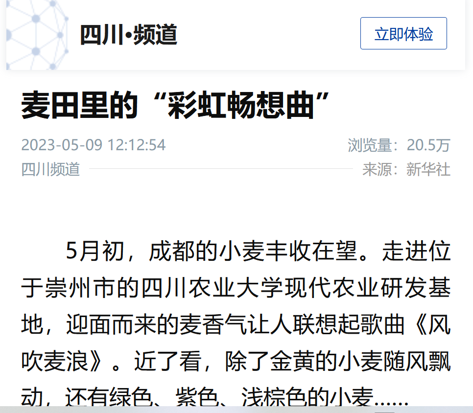 5月初,成都的小麦丰收在望。走进位于崇州市的四川农业大学现代农业研发基地,迎面而来的麦香气让人联想起歌曲《风吹麦浪》。近了看,除了金黄的小麦随风飘动,还有绿色、紫色、浅棕色的小麦……