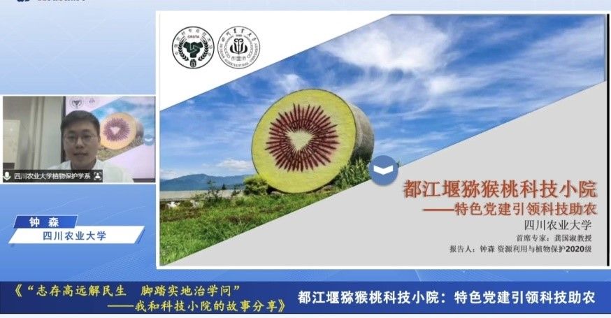 钟森以“特色党建引领科技助农”为主题对都江堰猕猴桃科技小院的建设进行分享。都江堰猕猴桃科技小院成立于2020年9月8日,由四川农业大学农学院植物保护学系专家团队带领科技人员、研究生长期驻扎农村和生产第一线,以猕猴桃病害综合防控为主战场,开展科技创新、技术服务,围绕当地农业生产中的问题开展科学研究,解决农民生产中的实际问题。科技小院的师生将已集成的3大技术进行推广应用,参与制作都江堰猕猴桃气象服务周报,开展病害防控田间指导,举办病害防控专题讲座,建立科普教育基地,进行病害综合防治科普宣传活动,建立新媒体科普阵地,参与成立“乡村振兴党员服务先锋队”、“都江堰猕猴桃科技小院支农助农党员先锋队”,依托小院组建科技志愿服务团队、社会实践团队、创新创业团队,以实际行动助力乡村产业振兴。钟森表示,包括其在内的12名研究生将继续紧跟科技小院专家团队的步伐,推动小院平台建设,加强研究生入驻,实现人才培养与科技实践紧密结合,同时不断加强党建引领,深入田间开展技术支农助农服务,“自找苦吃”“苦中作乐”同农户交流取长补短积累知识、积攒经验,厚植爱农情怀,练就兴农本领。