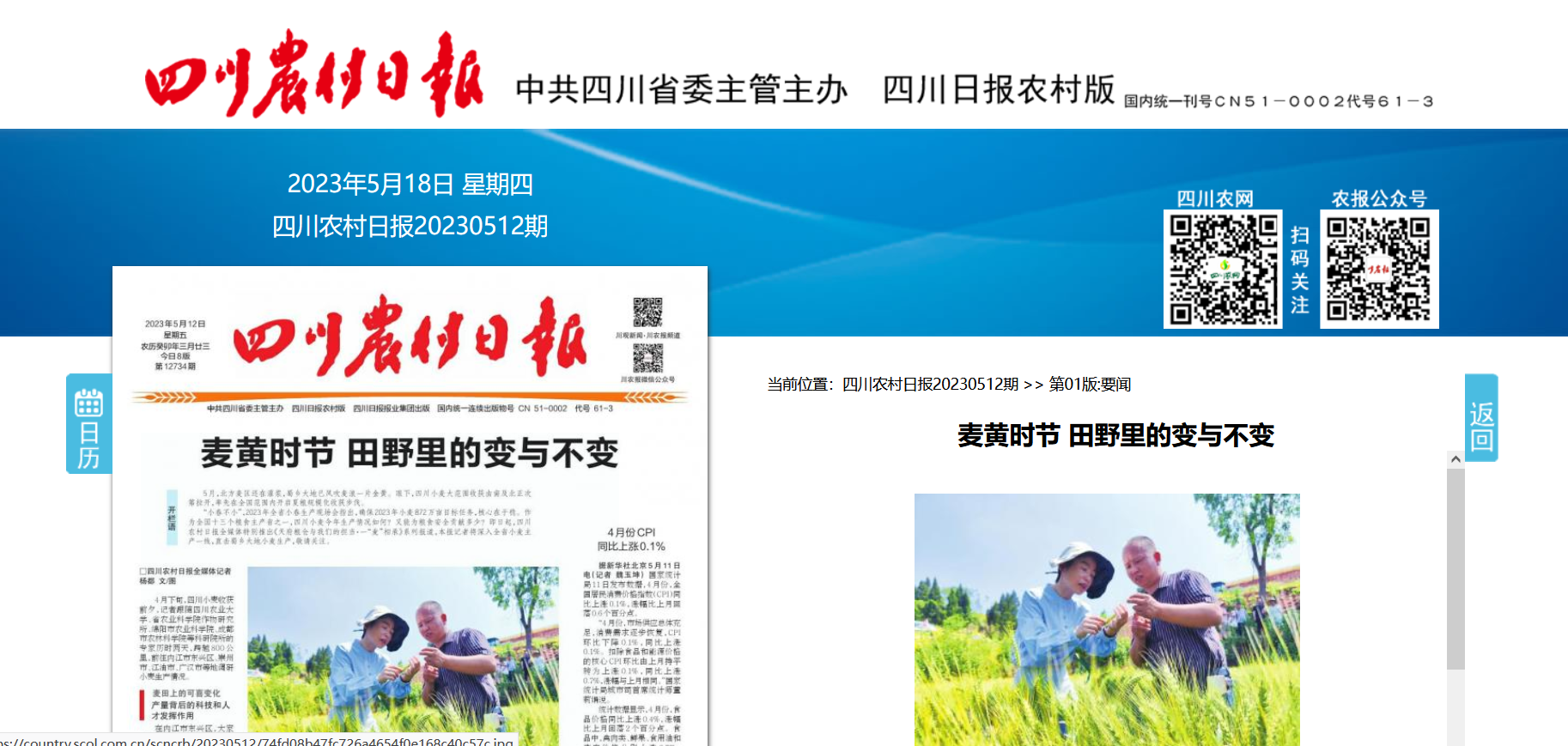 4月下旬,四川小麦收获前夕,记者跟随四川农业大学、省农业科学院作物研究所、绵阳市农业科学院、成都市农林科学院等科研院所的专家历时两天,跨越800公里,前往内江市东兴区、崇州市、江油市、广汉市等地调研小麦生产情况。