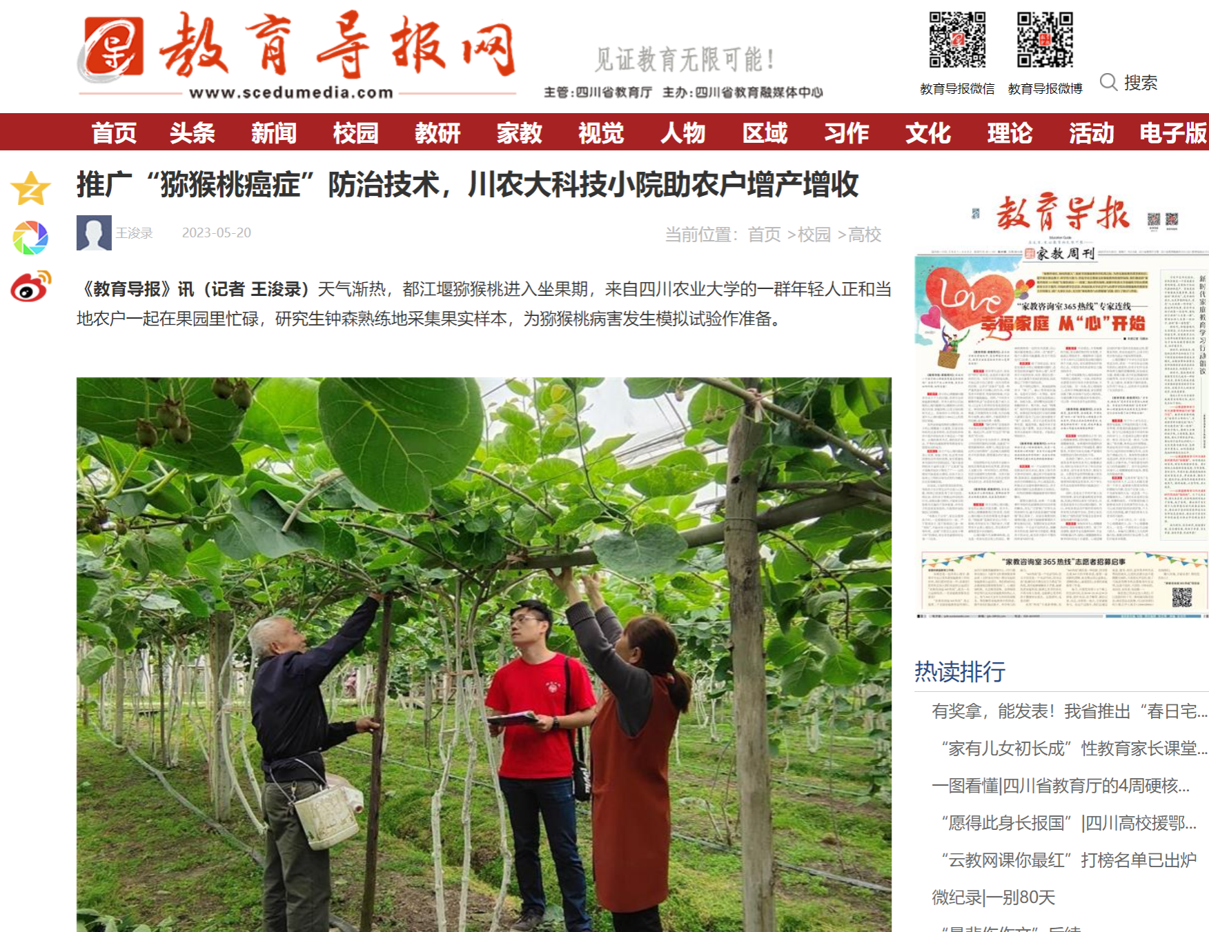 《教育导报》讯(记者 王浚录)天气渐热,都江堰猕猴桃进入坐果期,来自四川农业大学的一群年轻人正和当地农户一起在果园里忙碌,研究生钟森熟练地采集果实样本,为猕猴桃病害发生模拟试验作准备。