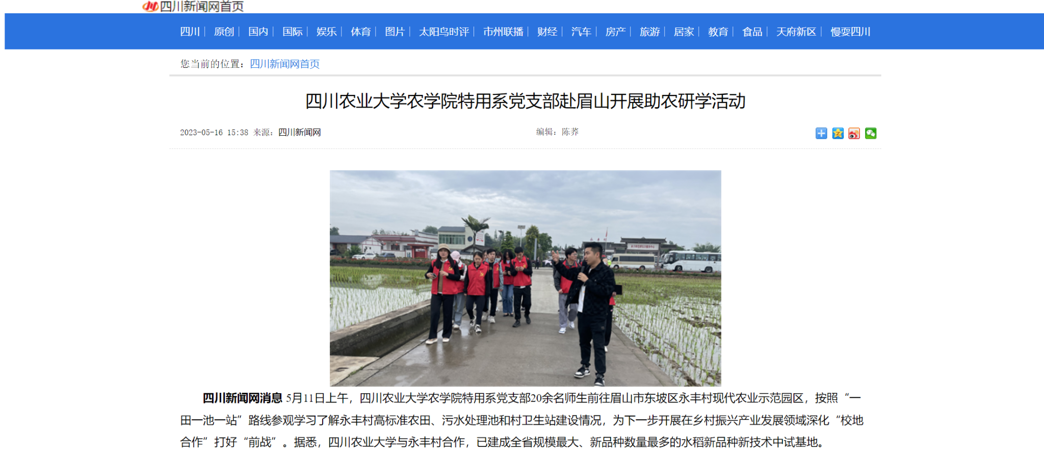 四川乐竞体育·(中国)官方网站网消息 5月11日上午,四川农业大学农学院特用系党支部20余名师生前往眉山市东坡区永丰村现代农业示范园区,按照“一田一池一站”路线参观学习了解永丰村高标准农田、污水处理池和村卫生站建设情况,为下一步开展在乡村振兴产业发展领域深化“校地合作”打好“前战”。据悉,四川农业大学与永丰村合作,已建成全省规模最大、新品种数量最多的水稻新品种新技术中试基地。
