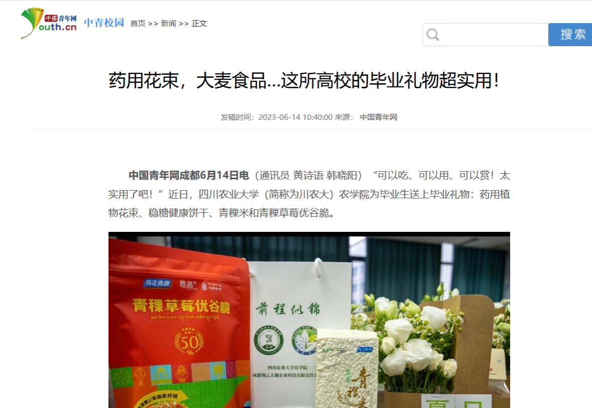 “可以吃、可以用、可以赏!太实用了吧!”近日,四川农业大学(简称为川农大)农学院为毕业生送上毕业礼物:药用植物花束、稳糖健康饼干、青稞米和青稞草莓优谷脆。