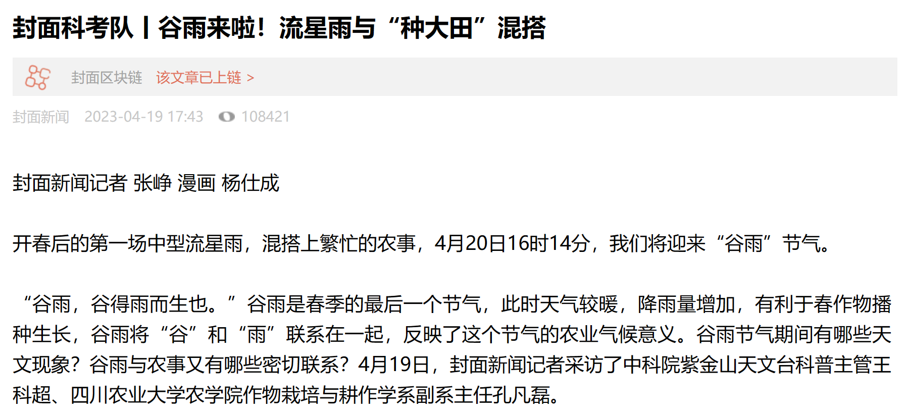 “谷雨,谷得雨而生也。”谷雨是春季的最后一个节气,此时天气较暖,降雨量增加,有利于春作物播种生长,谷雨将“谷”和“雨”联系在一起,反映了这个节气的农业气候意义。谷雨节气期间有哪些天文现象?谷雨与农事又有哪些密切联系?4月19日,封面乐竞体育·(中国)官方网站记者采访了中科院紫金山天文台科普主管王科超、四川农业大学农学院作物栽培与耕作学系副系主任孔凡磊。