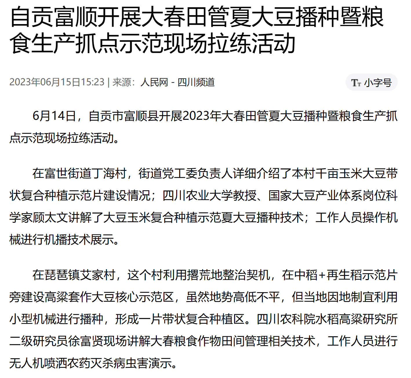 在富世街道丁海村,街道党工委负责人详细介绍了本村千亩玉米大豆带状复合种植示范片建设情况;四川农业大学教授、国家大豆产业体系岗位科学家雍太文讲解了大豆玉米复合种植示范夏大豆播种技术;工作人员操作机械进行机播技术展示。
