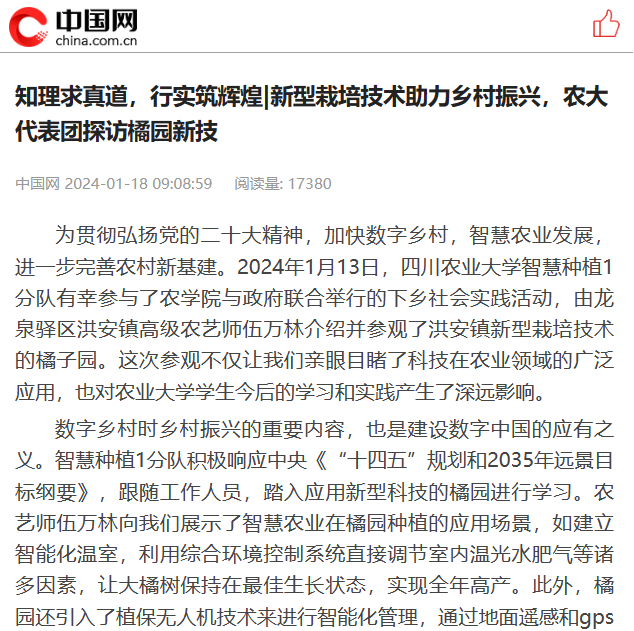为贯彻弘扬党的二十大精神,加快数字乡村,智慧农业发展,进一步完善农村新基建。2024年1月13日,四川农业大学智慧种植1分队有幸参与了农学院与政府联合举行的下乡社会实践活动,由龙泉驿区洪安镇高级农艺师伍万林介绍并参观了洪安镇新型栽培技术的橘子园。这次参观不仅让我们亲眼目睹了科技在农业领域的广泛应用,也对农业大学学生今后的学习和实践产生了深远影响。