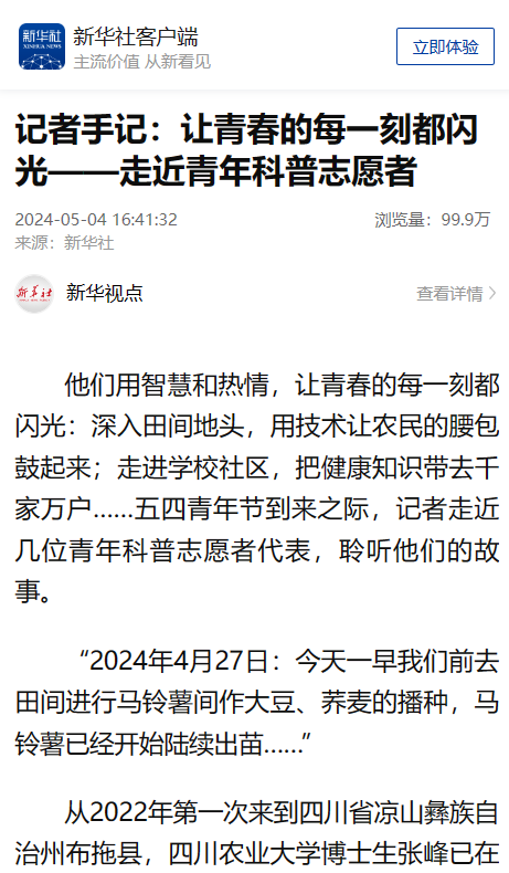 如今,布拖县的田野里涌出越来越多的高产土豆品种,张峰和同学们又有了新目标:探索马铃薯和其他饲料作物的间作模式,服务当地马铃薯和黑绵羊两大特色产业。