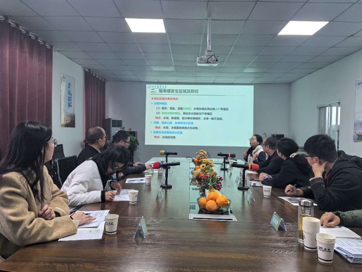 在座谈会上,杨春平代表课题组向与会专家详细汇报了我校在福寿螺防控工作中取得的进展,重点介绍了由我校研发的福寿螺智慧监测预警平台、引诱剂、生物灭螺剂系列产品和杀卵剂的研发过程,在福寿螺分区治理中的作用,以及示范应用效果。听取汇报后,调研组对我校福寿螺防控工作给予了充分肯定,希望我校进一步拓展示范区域,在全国福寿螺典型发生区进行推广应用。