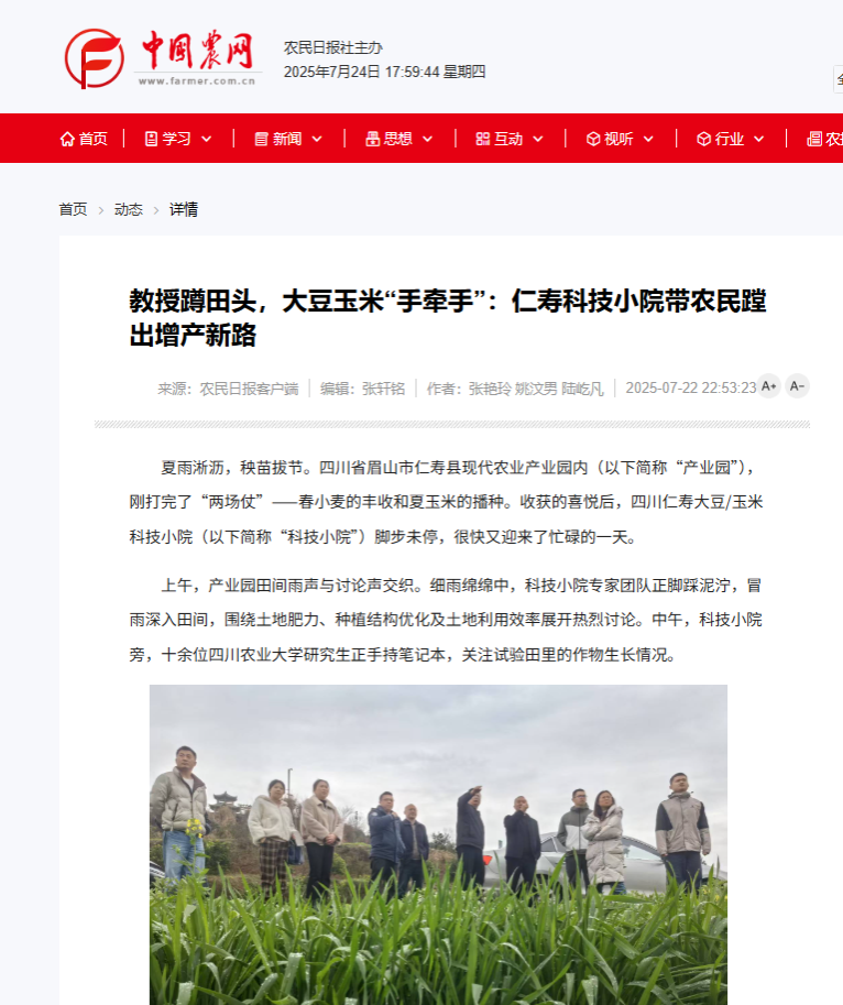 夏雨淅沥,秧苗拔节。四川省眉山市仁寿县现代农业产业园内(以下简称“产业园”),刚打完了“两场仗”——春小麦的丰收和夏玉米的播种。收获的喜悦后,四川仁寿大豆/玉米科技小院(以下简称“科技小院”)脚步未停,很快又迎来了忙碌的一天。