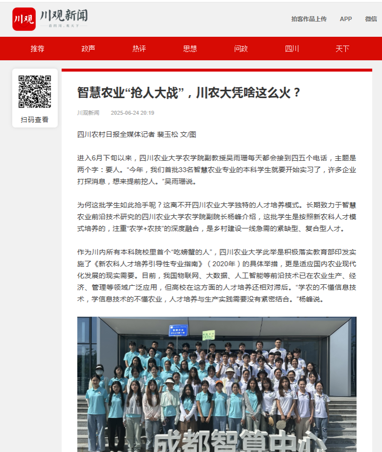 为何这批学生如此抢手呢?这离不开四川农业大学独特的人才培养模式。长期致力于智慧农业前沿技术研究的四川农业大学农学院副院长杨峰介绍,这批学生是按照新农科人才模式培养的,注重“农学+农技”的深度融合,是乡村建设一线急需的紧缺型、复合型人才。
