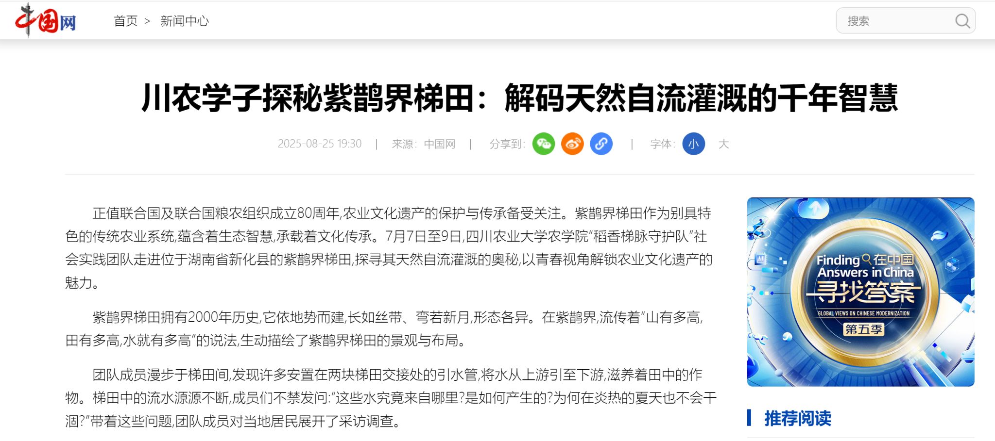 正值联合国及联合国粮农组织成立80周年,农业文化遗产的保护与传承备受关注。紫鹊界梯田作为别具特色的传统农业系统,蕴含着生态智慧,承载着文化传承。7月7日至9日,四川农业大学农学院“稻香梯脉守护队”社会实践团队走进位于湖南省新化县的紫鹊界梯田,探寻其天然自流灌溉的奥秘,以青春视角解锁农业文化遗产的魅力。