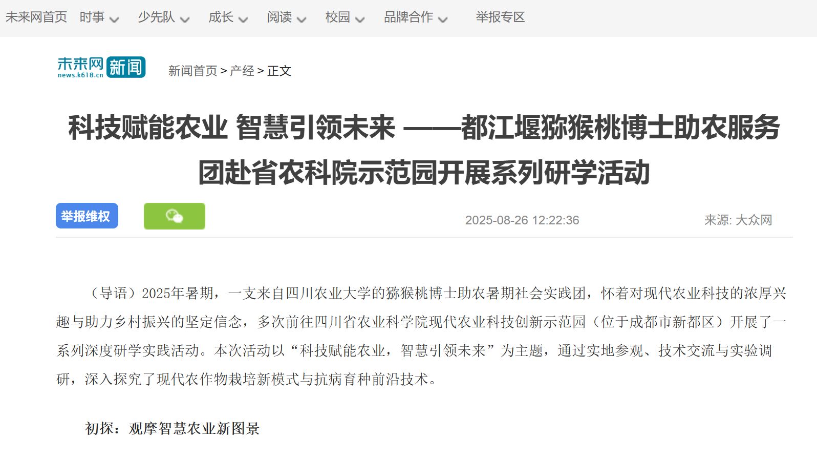 2025年暑期,一支来自四川农业大学的猕猴桃博士助农暑期社会实践团,怀着对现代农业科技的浓厚兴趣与助力乡村振兴的坚定信念,多次前往四川省农业科学院现代农业科技创新示范园(位于成都市新都区)开展了一系列深度研学实践活动。本次活动以“科技赋能农业,智慧引领未来”为主题,通过实地参观、技术交流与实验调研,深入探究了现代农作物栽培新模式与抗病育种前沿技术。