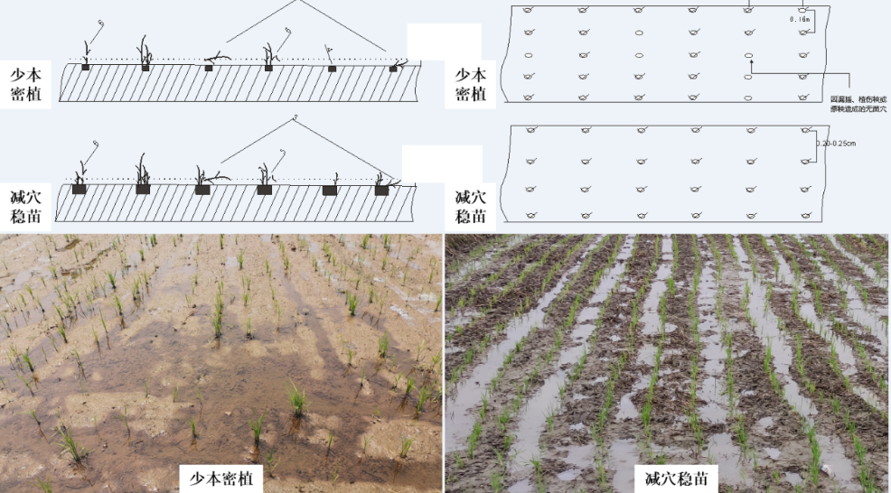 前期,团队发明了“一种机插杂交稻减穴稳苗大穗栽培方法(ZL 2016 1 0435960. X)”,在不改变单位面积用秧量的情况下,保持栽插行距不变,将穴距从12-17cm提高到20-25cm,穴苗数则从每穴1-2苗提高到3-4苗,实现“减穴稳苗”。以该方法为核心的“优质杂交稻保优提质绿色高效栽培技术”连续5年入选四川省主推技术。研究发现,“减穴稳苗”具有三大优势。一是提高了作业效率和栽插质量。因“减穴稳苗”取秧面积增大,栽插穴数减少,有效降低了机插秧田间漏插、漂秧和伤秧风险,使用该技术可使插秧作业效率提高16%,漏插率降低25%-41%,避免人工补秧,仅插秧环节每公顷可节本增效600元以上,深受种粮大户的喜爱。二是改善了群体微环境。因“减穴稳苗”穴距的增加,有效改善了水稻群体的通透性,使水稻群体能快速响应外界温度、湿度等环境因素的变化,降低了稻瘟病、纹枯病等喜湿病害的危害。三是增强了水稻群体抗倒能力。因“减穴稳苗”每穴茎蘖数的增加,发挥了“筷子效应”,增强了整穴抗推力,加之群体通透性的改善,水稻倒伏风险大幅降低。