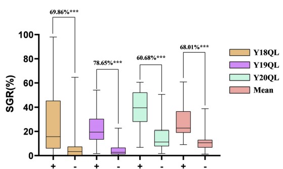 研究发现,凡是携带有该QTL位点的株系,其SGR值在不同的年份中分别为26.21%,21.92%,38.28%和28.95%(平均数),而不含该QTL位点的株系,其SGR值在不同年份中则分别为7.9%,4.68%,15.05%和9.26%(平均数)。两者之间具有显著差异(P<0.001)。