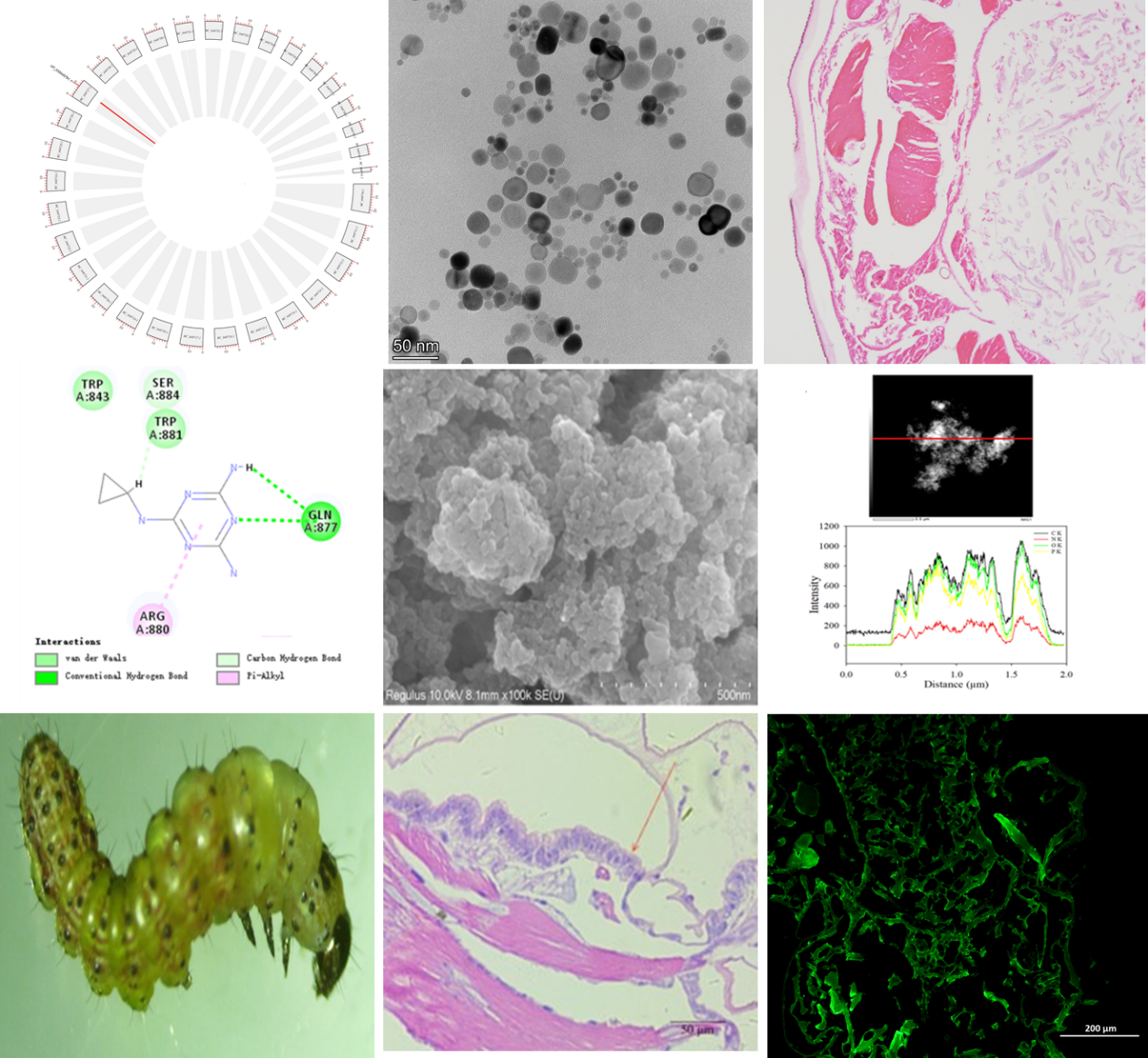 针对草地贪夜蛾抗药性的问题,课题组创制了环境友好型搭载siRNA和具有异于传统苯甲酰基脲类化合物结构的环丙氨嗪的纳米农药,通过沉默几丁质合酶基因,并竞争结合几丁质合酶的活性位点,双向抑制靶标害虫几丁质的合成,提高草地贪夜蛾的防控效果,降低了化学农药的使用量。该研究不仅改良了siRNA合成手段,降低了RNA的合成成本,提高siRNA在农业害虫防治方面的潜力,同时提高纳米递送技术提高siRNA的稳定性,增加了靶向农业害虫靶标的沉积量。研究内容以“Eco-friendly deacetylated chitosan base siRNA biological-nanopesticide loading cyromazine for efficiently controllingSpodoptera frugiperda”为题发表在International Journal of Biological Macromolecules期刊(论文链接:https://doi.org/10.1016/j.ijbiomac.2023.124575)(第一作者,贡常委,2021级农药学博士研究生),该研究为草地贪夜蛾的抗性治理提供了新思路。