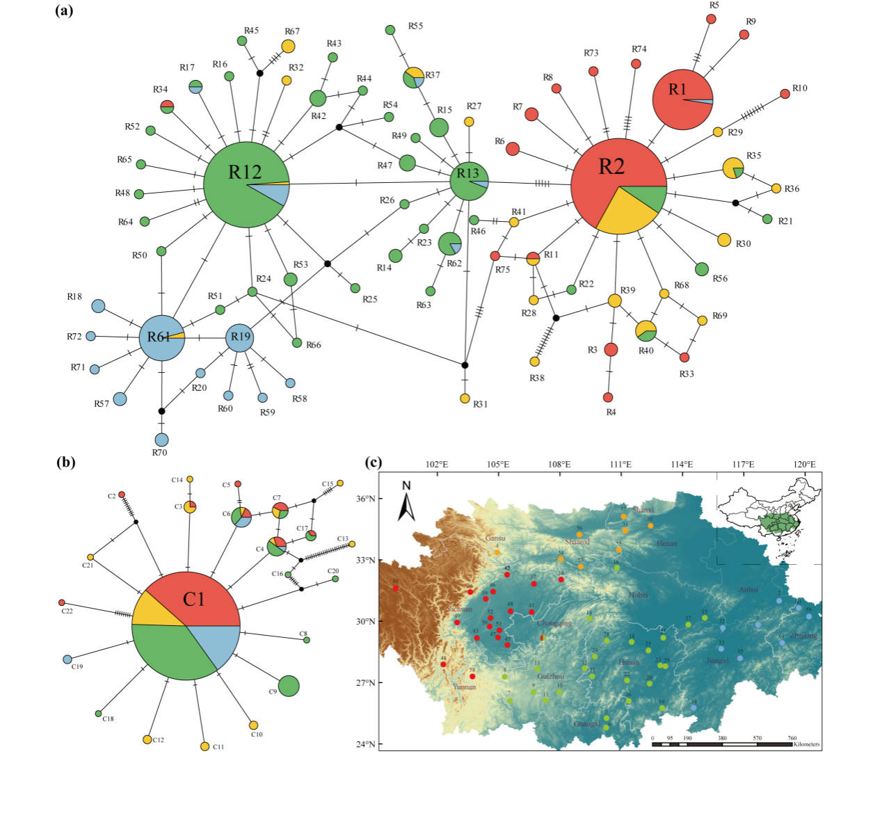 图1(a)三叶木通75种ITS单倍型的TCS网络图(b)三叶木通22种rps16单倍型的TCS网络图(c)三叶木通61个居群的采样分布图