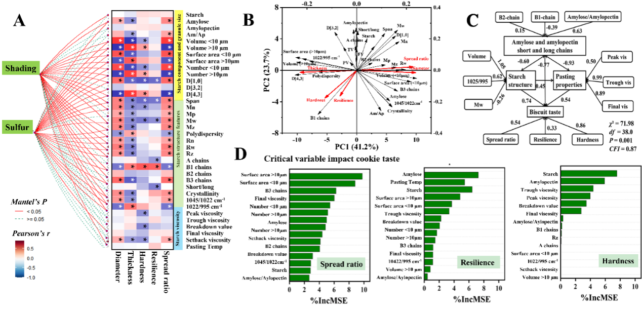 小麦籽粒淀粉组成和结构特性决定了饼干食味特性。然而,弱光胁迫下硫肥提升饼干食味品质的淀粉结构调控基础仍然不清楚。以四川农业大学小麦所育成的强筋和弱筋小麦品种为试验材料,在西昌试验站采用遮阴时期和硫肥水平的二因素裂区试验,探索硫肥影响饼干烘焙品质的多尺度淀粉结构调控基础。研究发现:弱光胁迫降低小麦籽粒中直链淀粉和总淀粉的积累,形成更多的小淀粉颗粒,导致淀粉平均分子量和支链淀粉中长链比例降低。淀粉组成和结构的变化降低了淀粉结晶度、粘度和饼干的延展特性。弱筋小麦对荫蔽反应更为敏感。硫肥提高了弱光胁迫下籽粒支链淀粉和总淀粉的积累,支链淀粉中长链的比例大幅提高,从而提升淀粉分子量和平均直径,降低饼干硬度。结构方程模型结合随机森林算法分析淀粉结构和饼干烘焙特性的关系,明确了淀粉颗粒表面积和支链淀粉中长链的比例是影响饼干延展特性的关键因子。总淀粉含量和支链淀粉含量是影响饼干硬度的关键因子。本研究验证本文重要假设:硫肥通过影响弱光胁迫下淀粉多尺度结构特性调控饼干食味特性。