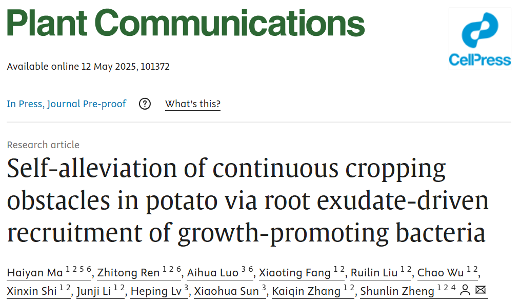 近日,四川农业大学郑顺林课题组在Plant Communications期刊上发表了题为“Self-alleviation of continuous cropping obstacles in potato via root exudate-driven recruitment of growth-promoting bacteria”的文章。本研究首次揭示了马铃薯自主适应连作障碍的机制,产生连作障碍的马铃薯植株利用根系分泌物川陈皮素定向招募Pantoeasp. MCC16提高根际IAA水平,进而提高苗期不定根数量,缓解连作障碍。这一发现有助于加深根际微生物对马铃薯连作障碍调控机制的理解,也为马铃薯连作障碍的绿色防控提供了理论支撑与科学依据。