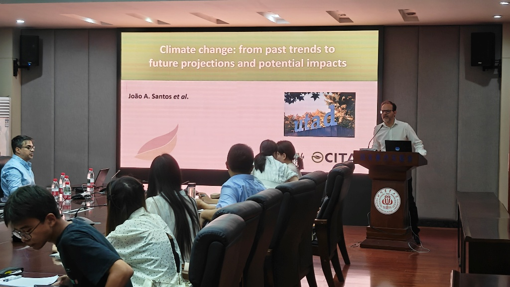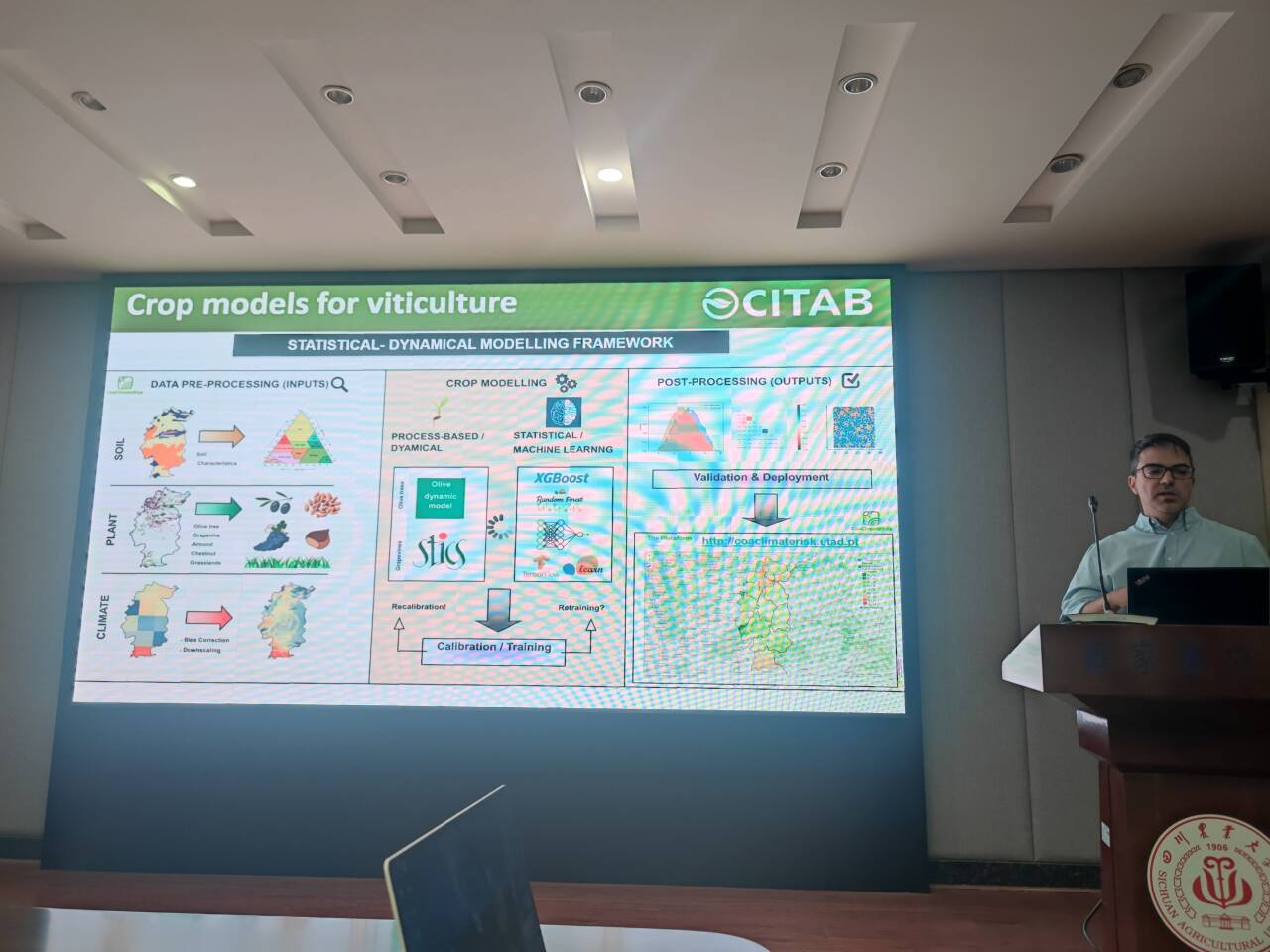 Enli Wang研究员以“Increasing Crop Productivity and Resilience in a Systems Context”为题,从农业生态系统角度阐释了生产潜力、环境效益与经济效益之间的平衡原理,并介绍了国际经典作物模型APSIM在中国及澳大利亚主要农作系统产量潜力评估、固碳减排潜力预测及气候适应策略设计等方面的应用案例。Santos教授以“Climate change: from past trends to future projections and potential impacts”为题,基于长期观测与最新情景模拟系统梳理气候变化的科学证据,结合政府间气候变化专门委员会第六次评估报告(IPCC AR6)与最新研究,分析极端气候事件对农业的损失,并阐释全球变暖驱动农业风险的形成机理与演变趋势。Fraga研究员以“Impacts of climate change on crops and adaptation options”为题,基于多情景与多模型评估指出未来气候变化将重塑欧洲葡萄的物候节律与产量格局;同时以实证研究表明,节水滴灌、覆草、品种/产地优化与微气候精细分区等适应举措,能够在一定程度上缓解水热胁迫、病害风险与产量下滑等不利气候影响。