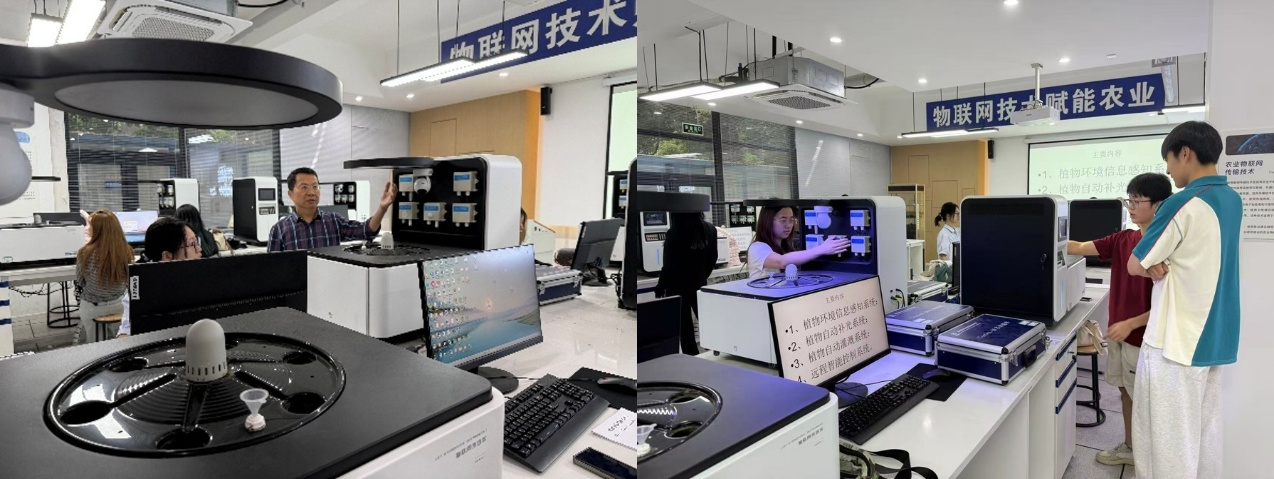 活动伊始,成都农业科技职业学院谢忠敏高级工程师结合智慧农业物联网实训系统,通过理论讲解与案例分析,分别从环境信息感知系统、自动补光系统、自动灌溉系统、智能控制系统等方面进行了讲解和演示。在实践环节,同学们通过温湿度、光照、二氧化碳浓度等多种传感器实时采集数据并上传至管理平台,依据数据变化,设置作物生长最适宜的环境参数,实现对作物智能生长的精准调控。