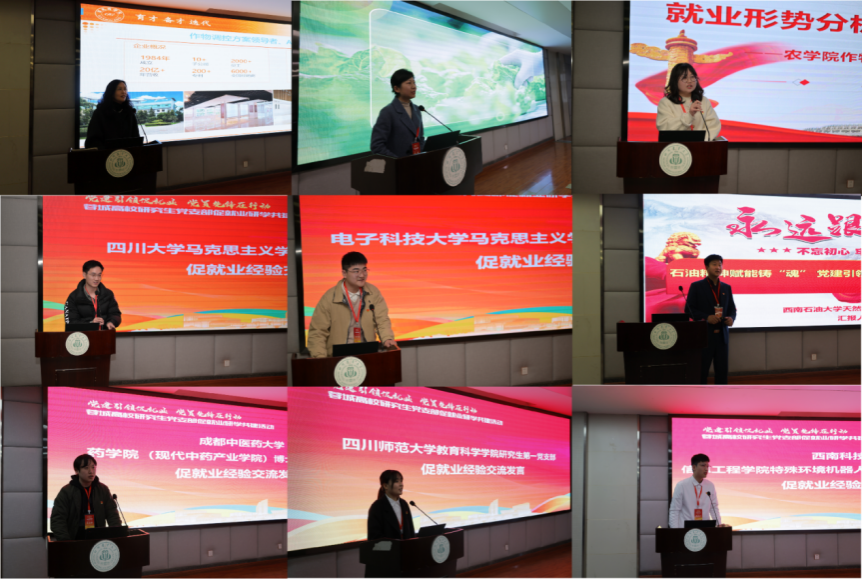 经验交流环节,我校农学院作物栽培学与耕作学硕士研究生党支部书记郑亭、四川大学马克思主义学院博士第二党支部刘国元、电子科技大学马克思主义学院硕士研究生第一党支部冯司雨、西南石油大学石油与天然气工程学院天然气现代产业博士党支部张继、成都中医药大学药学院(现代中药产业学院)博士研究生党支部张盛林、四川师范大学教育科学学院研究生第一党支部陈子怡、西南科技大学信息工程学院特殊环境机器人科学与技术研究生党支部陈尔达主要围绕就业形势、“党建+就业”探索路径以及“如何发挥党员先锋模范作用,投身服务国家战略需求”等主题进行了深入交流研讨。两家企业代表主要围绕企业人才需求与培养路径,并结合优秀个人发展案例展开了精彩的分享,为研究生的未来发展提供了多维度的思路与指引。