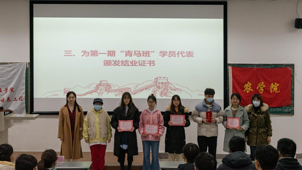 活动在全体参会人员奏唱团歌中拉开序幕。首先,农学院学生会主席杨杰宣读《关于授予第一期“青马工程”培养班学员结业证书和表彰优秀学员的决定》,在场的嘉宾老师为第一期“青马班”学员代表颁发结业证书并为第一期“青马班”优秀学员代表颁发荣誉证书。随后,第一期“青马班”优秀学员代表熊博发言,表示“在一年的学习过程中,我的组织工作水平有很大的提升和进步,青马班是提高工作水平和思想觉悟的大课堂,我为自己是这个集体中的一员感到骄傲!”第二期“青马班”学员代表胡楠号召大家,“作为农科学子,我们肩负着人民的重托,历史的重担,我们要有理想信念,点燃青春火炬,扬起爱国风帆。”最后,农学院党委书记黎明艳作总结讲话,她强调,“青马班涉及学生干部思想成长,社会实践、志愿服务等方面,将有效地夯实我院团学工作的基础,强化学生干部队伍建设,培养良好的工作作风。”希望学员们要向上向善,提高自身思想觉悟,将青马班作为理论与实践结合的实践地,在未来生活工作中继续发扬青马班的精神。