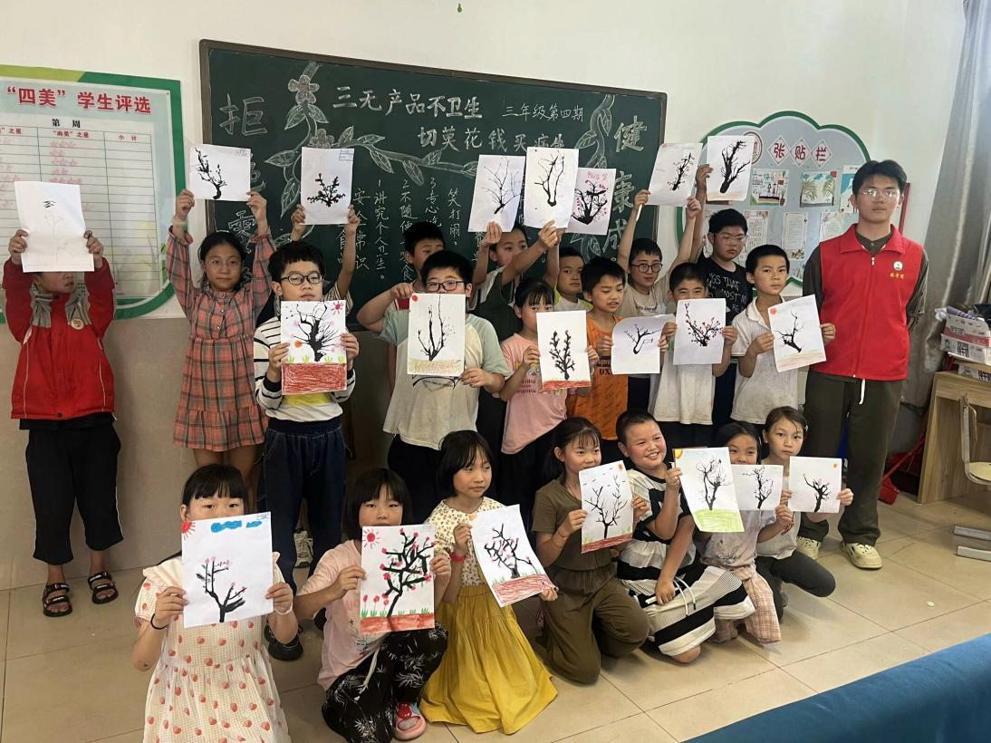 在文艺美术方面,团队成员张晟锴利用自己的美术特长,带领孩子们创作吹墨画,水墨丹青,栩栩如生,朵朵梅花在孩子们手下孕育新生。成员李奕婷带来有趣的汉字课程,黑板上的线条流畅、形态各异的字符如一幅生动的画卷,展示着远古文明的秘密。