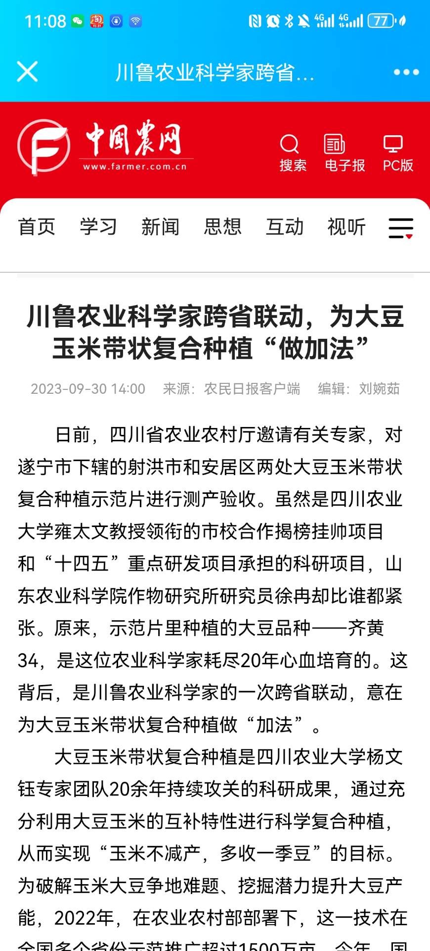 日前,四川省农业农村厅邀请有关专家,对遂宁市下辖的射洪市和安居区两处大豆玉米带状复合种植示范片进行测产验收。虽然是四川农业大学雍太文教授领衔的市校合作揭榜挂帅项目和“十四五”重点研发项目承担的科研项目,山东农业科学院作物研究所研究员徐冉却比谁都紧张。原来,示范片里种植的大豆品种——齐黄34,是这位农业科学家耗尽20年心血培育的。这背后,是川鲁农业科学家的一次跨省联动,意在为大豆玉米带状复合种植做“加法”。