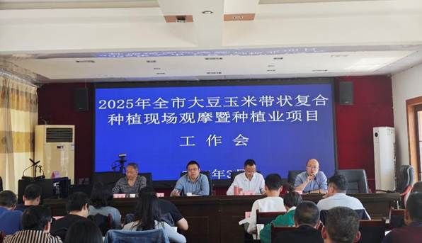 在遂宁市农业农村局组织的全市大豆玉米带状复合种植现场观摩暨种植业项目工作会上,雍太文面向各区县农技人员、种植大户及合作社代表100余人,系统讲解了大豆玉米带状复合种植的品种选配、机具调试、科学管理等技术要点。尤其是结合遂宁市大豆玉米带状复合种植扩面提产的工作需求,重点提出三项技术策略:一是优化行比配置模式,依据种植制度、地块条件、机具尺寸灵活采用“4:2”“4:3”“3:2”等模式,配套适宜株距和播种密度;二是强化农机农艺融合,鼓励业主改装现有机具,解决大豆播种时刮倒玉米、开沟追肥困难、植保依赖人工等问题;三是精准水肥调控,强调要通过铺设微喷带、滴灌带等节水灌溉设备保障水源供应,结合后期的叶面微肥喷施,为作物高产打下基础。